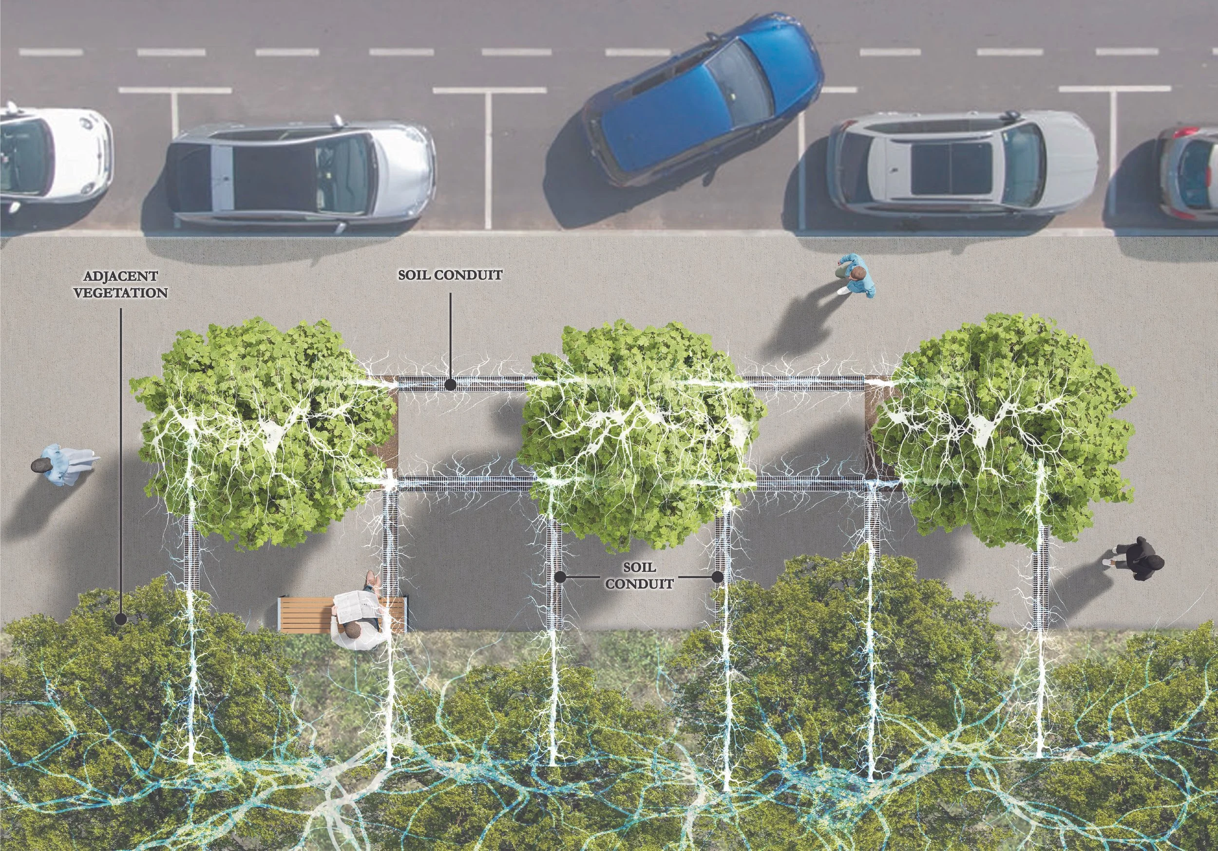 The Soil Conduit is currently being tested in the field through an applied installation near Montréal, located within a commercial parking lot. This pilot project connects two existing trees through a shared soil corridor, translating laboratory and experimental research into an operational urban context. As the first industry-based proof of concept, the installation allows the Soil Conduit to be evaluated under real-world conditions, providing critical insights into constructibility, performance, and integration within highly constrained urban sites.