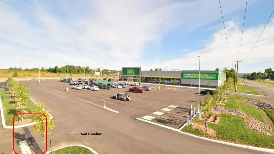 Pilot installation of a soil conduit in a commercial parking lot near Montréal. The conduit connects two trees through an underground soil corridor designed to support root growth and mycorrhizal network connectivity within a highly paved urban environment.